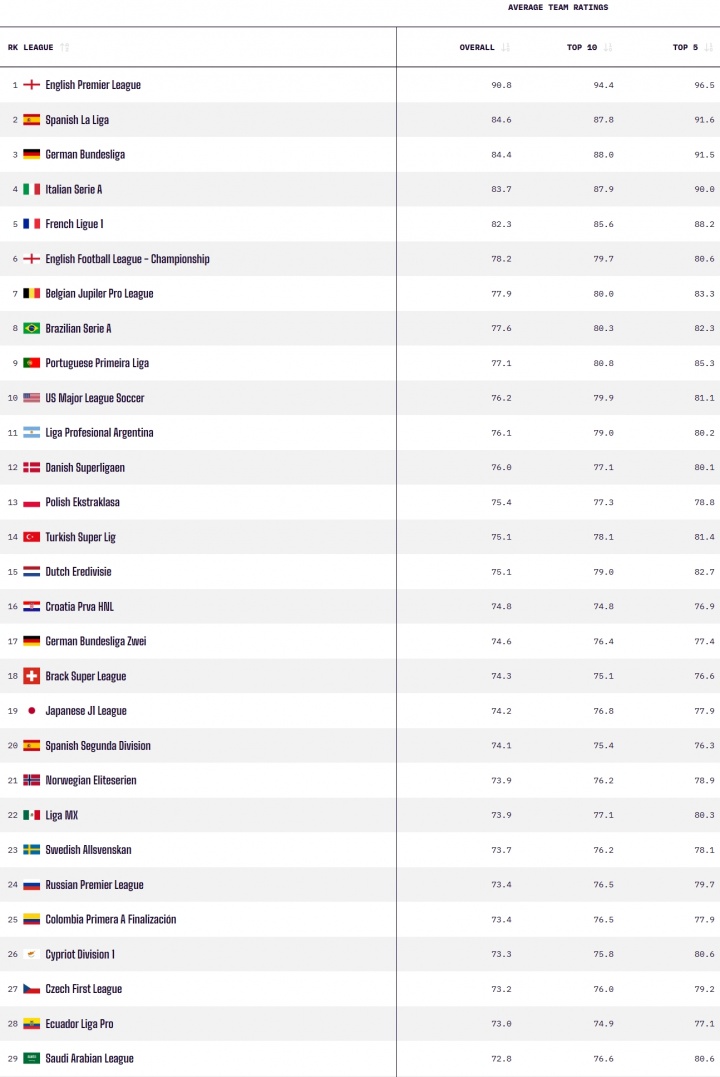 2025-11-08 00:01:23全球联赛实力排名:英超西甲德甲领跑,沙特联第29,中超第107